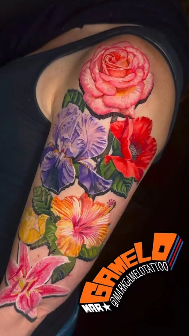 Trained through a rigorous apprenticeship and years of studio experience, Mark has developed a reputation for clean lines, solid saturation, and designs that hold their integrity for decades. His work often explores themes of mythology, nature, and personal symbolism, blending time-honored motifs with his clients’ stories.